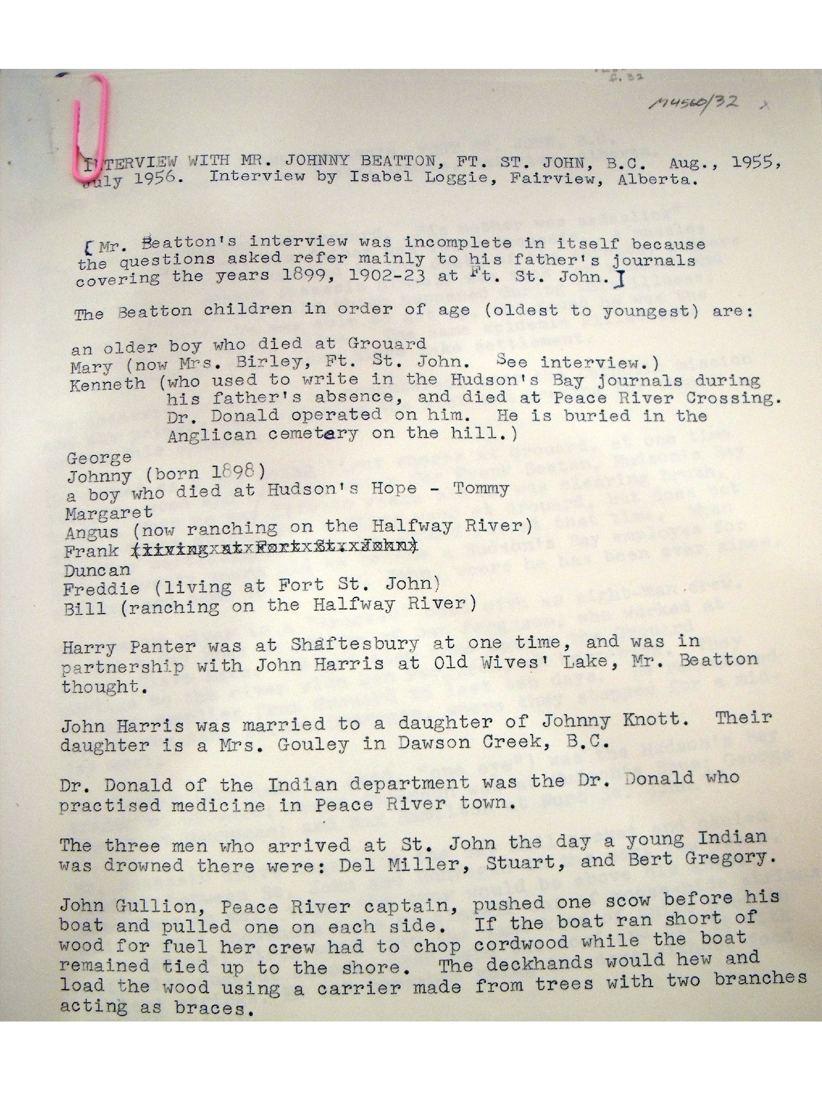 The following interview with Johnny Beaton was conducted in August 1955 by Isabel Loggie at Fort St. John, B.C.