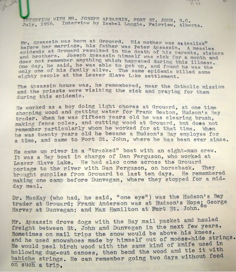 The following interview with Joseph Apsassin was conducted in July 1956 by Isabel Loggie at Fort St. John, B.C.