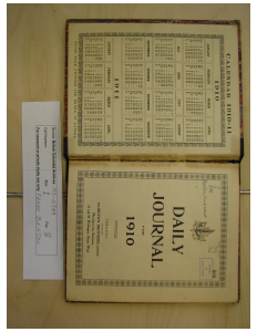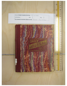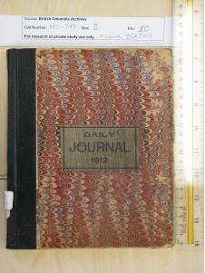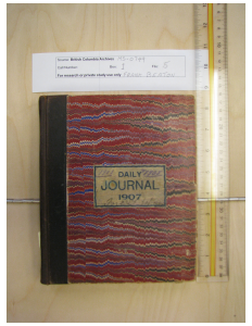 Daily journal for Fort St. John in 1907 and 1908. Contains Sterling exchange, Canadian tariff of customs, banks in Canada with their agencies, postal information, mercentile law, sittings of the Courts, joint stock companies, game laws, Canadian tariff of customs, and the French Treaty. Also contains blank pages for memorandum from 1906, followed by the daily events for 1907 and a couple of dates filled in for 1908. The last pages contain blank pages for memorandum and bills payable.