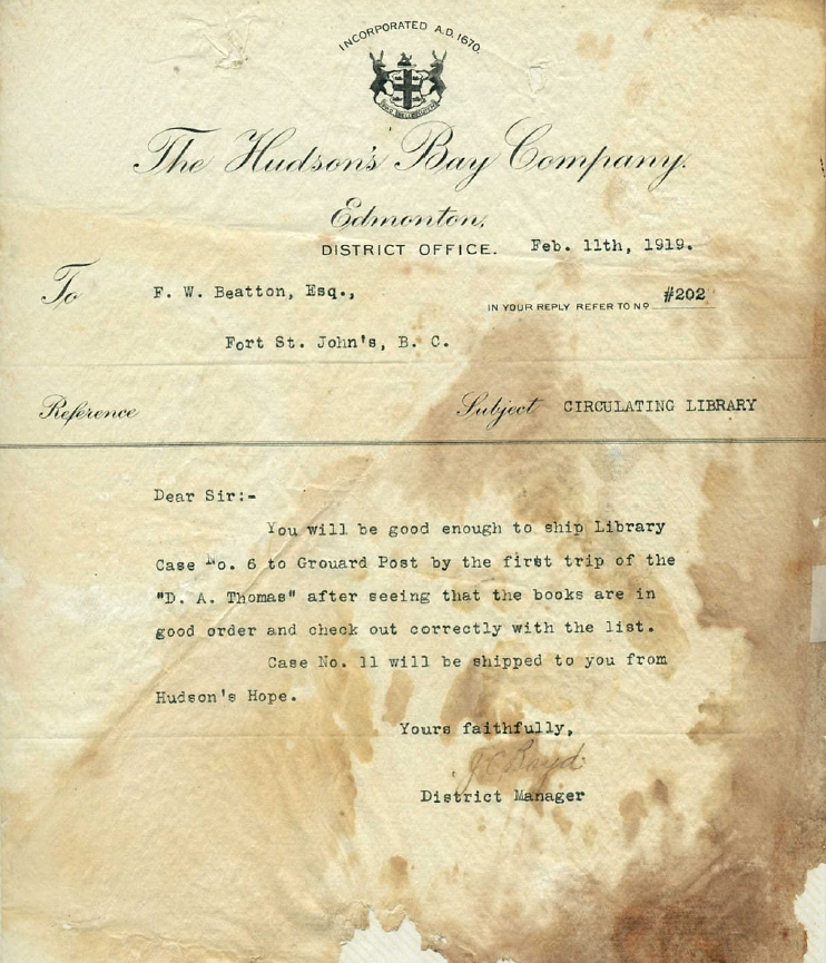 The following document includes three original letters to F.W. Beaton from HBC District Manager J.C. Boyd. Dated 1919. Letters donated by Patrick Woods