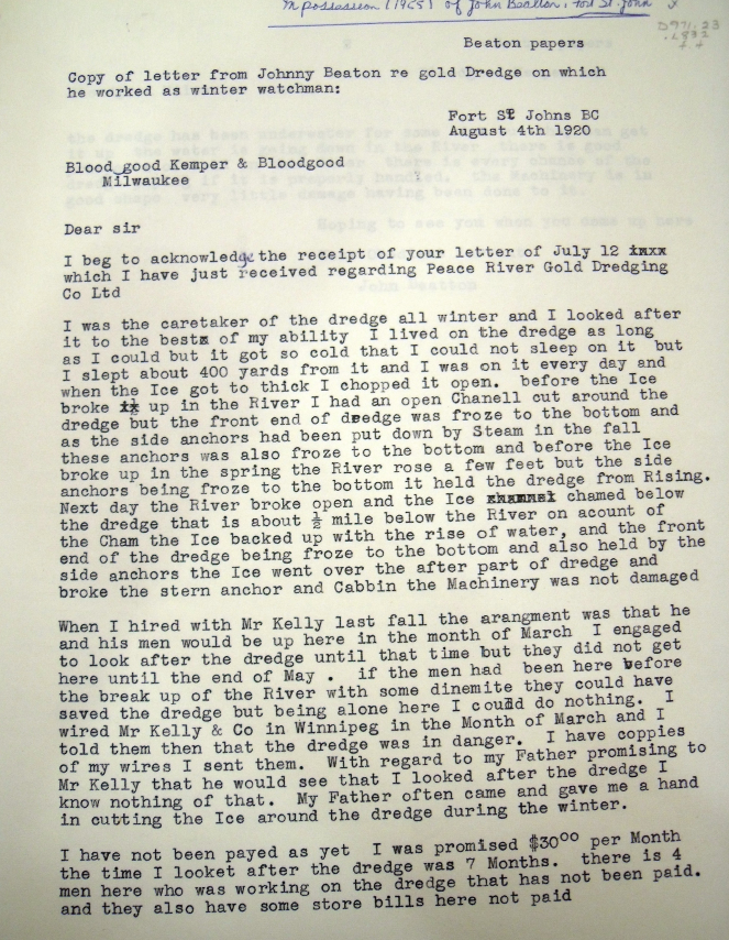 The following document is a copy of a letter From Johnny Beaton regarding the gold dredge on which he worked as winter watchman. Dated August 4th 1920.
